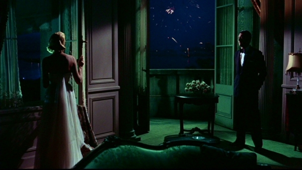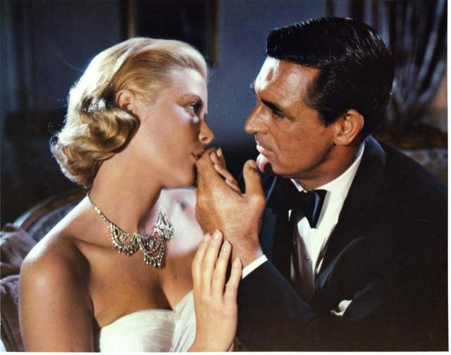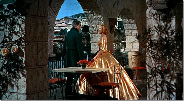 It’s not feasible to describe every single scene worthy of note. There are too many of them. So, let me just mention the most obvious of them. My favorite. Pure Hitchcock – the one I call the “elephant in the room is a brilliant necklace” scene. There stand Francie Stevens and John Robie in her glorious suite in the Carlton Cannes Hotel. By now the pair is “friendly” and on this particular evening they are dressed for an evening of cocktails and dinner – er…and some desert. He is in a tuxedo only the likes of Cary Grant can carry, she, in a gorgeous white gown. Lights are dimmed, French doors open out to the Riviera sky. Green hue present, signaling the possible presence of the cat.