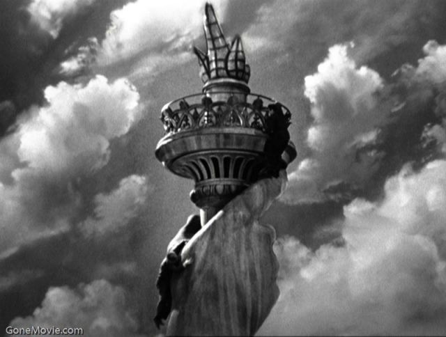 Signature Hitchcockian visual elements are evident in Saboteur from start to finish. We see the close-ups of the letter in the beginning that lead Kane to find Tobin (Otto Kruger), the evil mastermind in the film, and a close-up of another letter in Tobin’s house later in the story. The use of a train as a setting – it is where Kane and Pat (Priscilla Lane, the girl) meet the circus performers (which incidentally have some similarities to a few of the peripheral characters in The Lady Vanishes), and the most famous moment in the film, the Statue of Liberty scene where the film climaxes. Aside from the obvious mentioned above about Hitchcock and his use of famous/familiar symbols, this scene has two great and typical Hitchcock shots in it that are worth mentioning. The first is the way Hitchcock shot Fry’s (Norman Lloyd) jacket breaking apart stitch by stitch as the thread is the only thing keeping him from falling to his death. The other is the way Hitchcock chose to use only the sound of roaring wind as what we hear as Fry hangs there. The fact that we hear nothing but the wind enhances the suspense and terror as Fry hangs on for his life. As much as I love film music, the fact it is often overused make music-less scenes memorable.