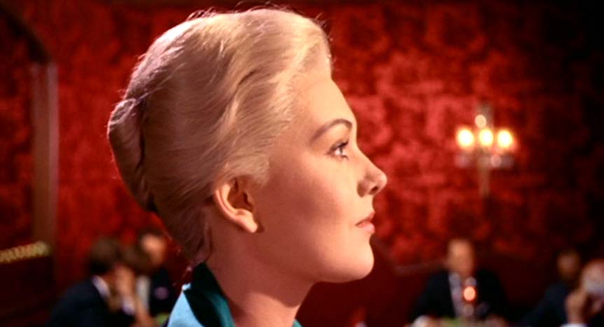I have to take the time to discuss another gorgeous Hitchcock blonde introduction in this film. Another by way of a steady camera and the actor moves ever-closer into an extreme close-up. This time in profile. This one has magnificent color, the actor poses deliberate in a close-up so the shot is familiar again later in the film and it all simply takes your breath away. I am referring to the first time we see Kim Novak as Madeleine. The camera follows her from afar as she walks toward us in a beautiful gown of emerald green. As she approaches the camera she stops in a complete close-up, in profile, against a bright, scarlet background. It’s an absolutely gorgeous shot, which makes us understand Scottie’s subsequent obsession as who wouldn’t be twisted in the gut when seeing this vision (and I’m not referring to Kim Novak – just the entire picture that is set before our eyes). So deliberate and planned is this one shot that much later in the film we see Novak (as Judy) in her room – again in profile as a dark silhouette against a backdrop of emerald green, caused by a neon sign outside the window – “…cuz I remind you of her?” The obsession is now in full tilt, it’s all manipulative and it’s all brilliant.