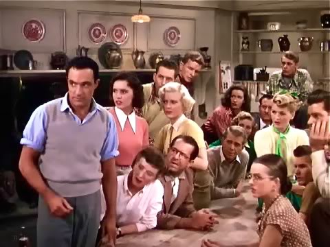 Then Mr. Kelly and his troupe arrive and by Jane’s insistence, pitch in to do their share of the farm chores.  Hilarity!  I can picture myself, a city girl afraid of the smallest bug trying to feed chickens and hogs.  I’d never be as funny as Phil Silvers though. “Whatta ya think they got ME doing?  Picking eggs.  EGGS!  E-G-Z!”  Of course, this convergence of thespians on a farm also lends toward other wonderful numbers, including the fun, “Dig, Dig, Dig for Your Dinner”  and a duet by Kelly and Silvers of “Heavenly Music” late in the film, which I love.  I call it a duet but the two share the stage with a variety of very vocal dogs.