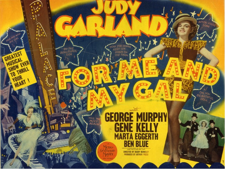 Gene Kelly was a smash hit on Broadway as the star of Pal Joey, the Rodgers and Hart musical that opened at the Ethel Barrymore theater on the great white way in December 1940.  By that year, Judy Garland was a seasoned veteran of film musicals and one of MGM’s biggest stars.  Due to Kelly’s success in Pal Joey he would get a contract with MGM Studios and make his screen debut in Busby Berkeley’s, For Me and My Gal (1942), starring none other than Judy Garland – incidentally, this was the first film where Garland’s name appeared before the title, her star had reached the top at the studio at the top, while Kelly’s started its climb.  And by all accounts he never forgot how supportive she was, taking him under her wing and showing him the ropes.  It is said that it was Judy Garland who actually got Kelly the job on For Me and My Gal after having seen him on stage in Pal Joey.
