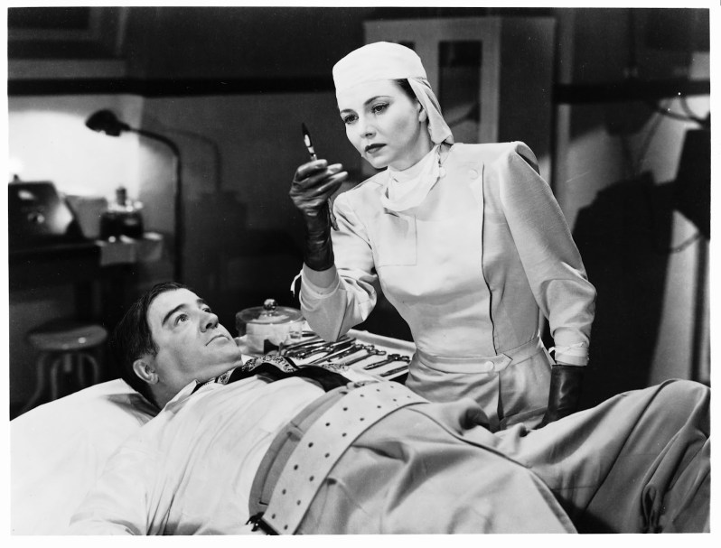Of course, both The Monster and Dracula come “alive” only in front of Wilbur as he attempts to unpack the content of the crates and no one believes him when he tries to tell them. But the creatures do awake and soon escape to Dracula’s castle where Sandra Mornay is waiting. Sandra is this film’s version of Frankenstein, the Doctor. She’s a surgeon who’s ready to assist Dracula in putting a new brain into the Monster using the notes left behind by Doctor Frankenstein as a guide. Whose brain do they intend to use? Wilbur’s. Sandra has been “amorous” toward him in preparation of the grand event. Wilbur’s brain is perfect because they don’t want to end up with a “vicious, unmanageable brute,” which was Doctor Frankenstein’s mistake. This time they want the brain of someone with “no will of his own, no fiendish intellect.”
