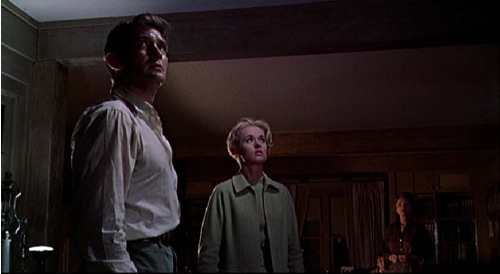 One of the ladies in our group last night with whom I was discussing the film after it was over mentioned she thought the final message of the film was that love conquers all. She felt the sign was the fact that Cathy’s love birds were never affected by whatever affected the other birds plus the connection made between Melanie and Lydia in the end. This had never occurred to me. My take is the doom-filled one I describe above. But it’s an interesting interpretation and may say something about my psychology. Or is it simply that Hitchcock films have my number?