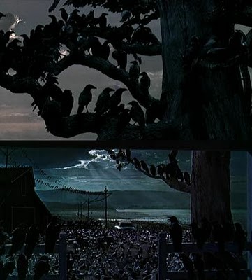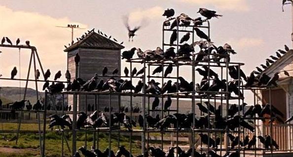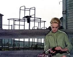 So, anyway, Melanie is sitting there and we see shots of the jungle gym in the school yard. We see birds gather on it, hear the children singing, and increasingly closer shots of Melanie’s face – masterful edits to heighten the suspense and it gets mighty uncomfortable to look at. Time elapses, the song continues, the birds continue to gather. But she doesn’t know what we know. Suddenly she notices a crow flying in and follows it to where it’s headed – behind her – the jungle gym, which we now see is completely covered with birds. CHILLING! A low gasp is heard from the audience. Rather than one scene of shock, Hitchcock strings us along. Allowing us to know about the congregating birds while Melanie’s clueless. Anxiety builds until we can’t take it any more. All of that was simply multiplied on the big screen, heightened. The sounds of that song – over and over and over again. The brilliant manipulation of the Hitchcock camera. What more can be said. Excruciating scene.
