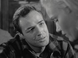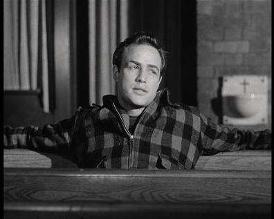 where he’s talking to Edie (Eva Marie Saint) in the bar sharing a beer. She tells him at one point that “…there’s no spark of sentiment or romance or human kindness in your whole body” and that’s exactly what he does have here, all of it. As he is shot from the front I could feel his vulnerability by seeing his whole expression and emotions, in short, the whole truth. The fact that he is starved for affection, love and support is clear and evident and I want to hug him – literally. Brando’s innate sensuality comes across in this film and it is palpable despite his character being a tough guy. There is a softness to him that reaches the deepest recesses of my soul – a softness not from weakness, but vulnerability, from hurt. I can’t describe it any better and do it proper justice, but it is very powerful. Marlon Brando’s physical attractiveness and rough exterior blended with an internal innocence