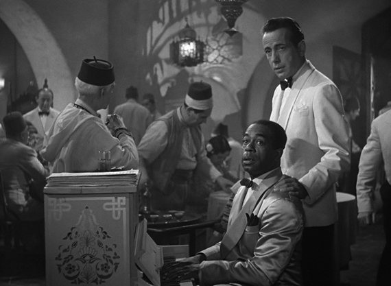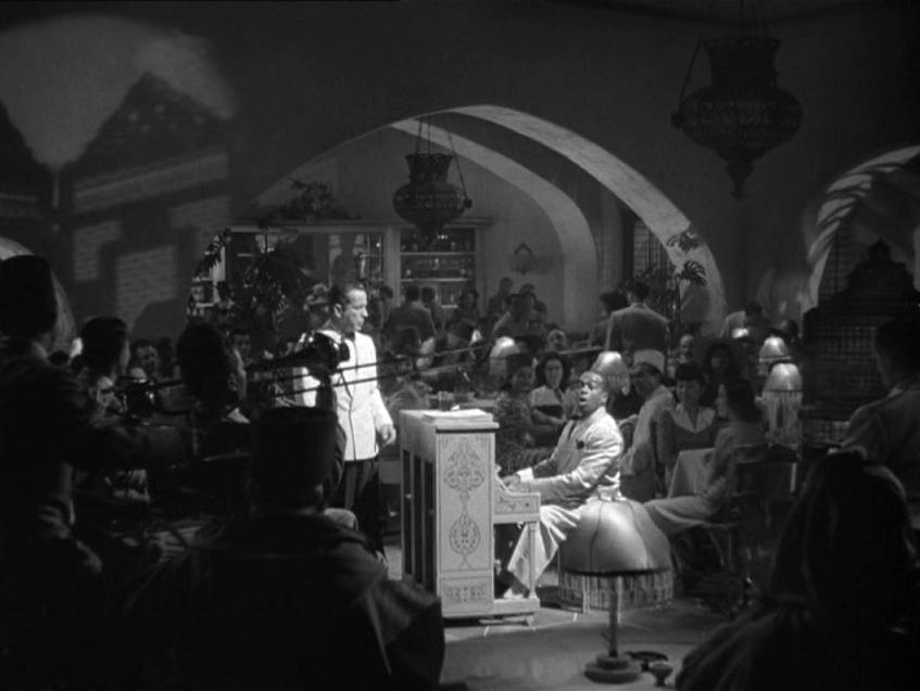 Rick’s Café Americain has been called a mini U.N.  – or at least was called this by one of the professors I took film courses with.  The reason for this is obvious, the patrons of this establishment represent many countries in the world, and, Rick’s plays the role of neutral shelter, in a sense, where people come to wait for their chance to go on with their lives.  The patrons of Rick’s represent a cross-section of the world.  Rick’s also represents America, which in turn represents freedom.  “Everybody comes to Rick’s” – it is where deals are made and where time is passed.  And perhaps another important thing to point out is the fact that although the patrons of Rick’s Café Americain are literally from all over the world – they are more alike than they are different in that their goal, as they go about ordering drinks and singing along with Sam (Dooley Wilson), is to get out of there.