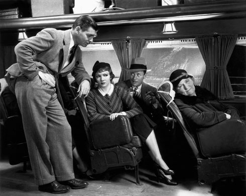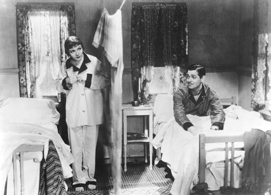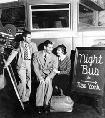 On class distinctions – Placing a rich, spoiled brat (how Peter refers to Ellie throughout the film) on the road to travel as “common” people lends itself to plenty of situations where we can see the differences between the classes and many fun exchanges and situations.  For instance, when Ellie gets off the bus and asks the bus driver to wait for her she completely expects him to comply because she is used to being catered to.  Also, while she and Peter are experiencing difficulties during their travels with weather and lack of money, etc., we see the contrast to her father’s looking for her where everything is at his whim, including getting a plane to fly at a moment’s notice despite inclement weather.  Even the elements affect the rich and famous in very different ways than they do the poor.  When Elie wakes up at the bus depot room and goes out to shower she walks right up to the front of the line, completely ignoring the other women waiting there.  Again, she is not accustomed to waiting for anything.  The bus itself and the riders on it serve as a perfect example of how middle to lower class people often find entertainment in simple things like the sing-a-long of the trapeze song, one of my favorite scenes in the film.  The fact that they can all join in the song shows that they have a lot in common besides the actual bus ride.  These people seem perfectly comfortable in the cramped quarters of the bus and with having to fill their time with the small things that matter, all things that one wouldn’t expect the upper crust of society to be familiar or content with.  There are many other examples in this film to show the differences between the classes, including the fact that Peter is able to find food when he needs to (the carrots) but she resists eating them “raw” and dirty even though she’s starving.  There’s one other scene in particular that is poignant and worth mentioning in regard to class differences – after Ellie calls her father to come pick her up, he does so with police escort and chauffeur, meanwhile Peter is happily returning to her in his smoking, shaky jalopy and flat tire.  It’s so romantic, sweet and truthful – a huge step up for him from having to hitchhike – yet such a contrast to the police-escorted motorcade that whizzes by him.