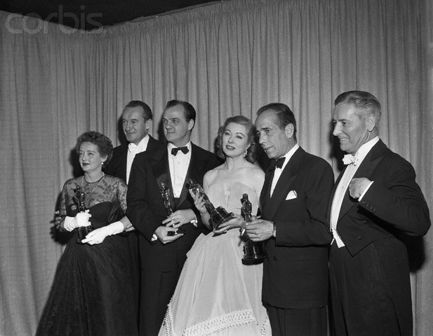 24 Mar 1952, Los Angeles, California, USA — Celebrities pose with their Oscars after the 1951 Academy Awards ceremony. From left to right: Bette Davis, George Sanders, Karl Malden, Greer Garson, Humphrey Bogart, and Ronald Colman. Davis accepted the Best Supporting Actress award on behalf of Kim Hunter, who won for her role in . Malden won the Best Supporting Actor award for his role in the same film. Garson accepted the Best Actress award on behalf of Vivien Leigh, who won for her role in . Bogart won the Best Actor award for his role in . — Image by © Bettmann/CORBIS