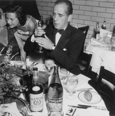 20th March 1952: EXCLUSIVE American actor Humphrey Bogart (1899 – 1957) sits at a table with place settings and liquor bottles, holding up his Best Actor statue at the Academy Awards, RKO Pantages Theater, Los Angeles, California. Bogart won the Oscar for his role in director John Huston’s film, ‘The African Queen.’ (Photo by Murray Garrett/Getty Images)