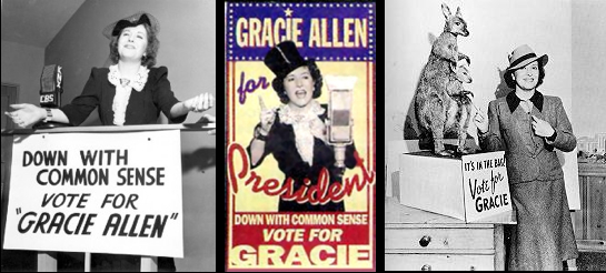 I remember the gag about Gracie Allen running for president. My memory is a little different in that Gracie withdrew from the presidential race because, as she stated on the air, “What woman wants to admit she is over 35?” is what I vividly remember her saying when she withdrew from the presidential campaign. Jean Strauber
