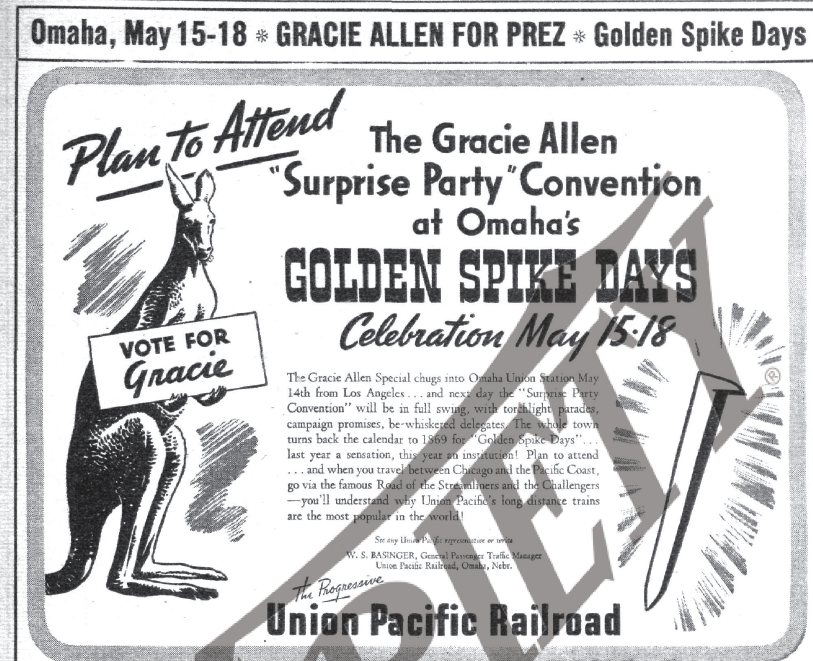 It was the same way for all the scheduled stops – thirty-four in all as the train headed for Omaha. In every town schools closed and special sales were held in Gracie’s honor, which was perfect because shopping was Gracie Allen’s favorite pass time. By the end of the tour, Gracie was a real presidential candidate. On May 17th, 1940, eight thousand delegates nominated Gracie Allen for President of the United States. There was no Vice President on the ticket. Gracie didn’t want any vices.