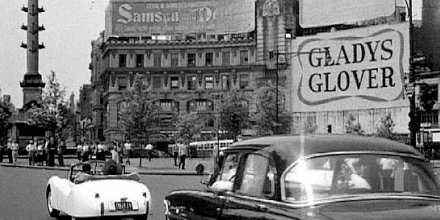 Anyway, as the tour proceeds through the streets of NYC, clips that correspond to each site are shown on the various screens throughout the cabin.  For instance, as we approached Columbus Circle, the first official site on the tour, we saw clips from Charles Lamont’s, Ma and Pa Kettle Go to Town (1950) during which the hillbilly couple takes a stroll through the Circle and another from George Cukor’s, It Should Happen to You from (1954) where we see Judy Holliday visualizing her name on a billboard, GLADYS GLOVER.