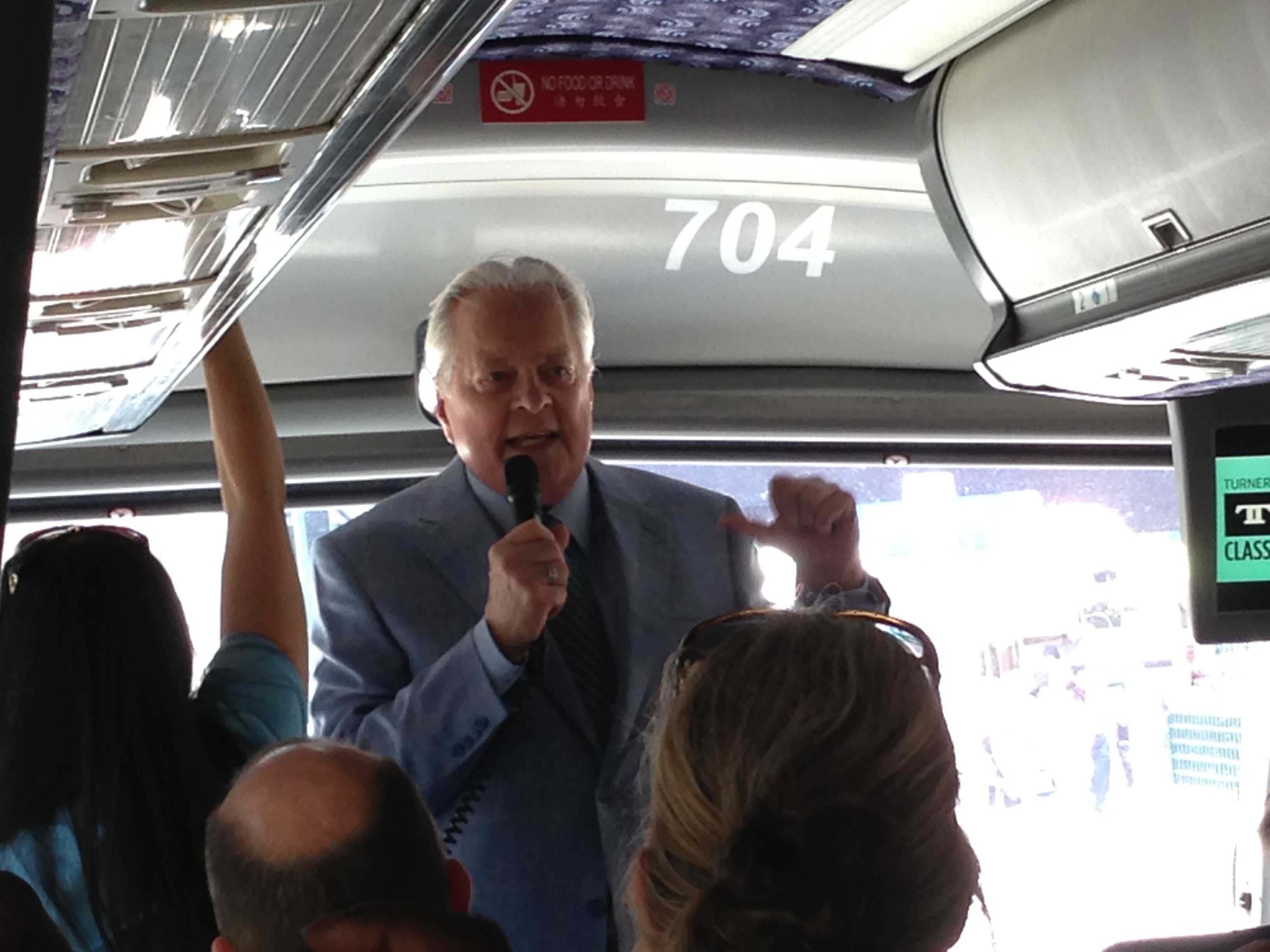 The tour group met at Cosi on the corner of Broadway at 51st Street.  We checked in and were given press releases and a tour t-shirt to commemorate the maiden TCM Classic Film Tour.  As I sat waiting for word of our departure, in comes Robert Osborne and joins a lady sitting at a nearby table.  A moment after he sits he turns and says hello to me, asking how I am.  I respond in kind sure that what made him turn toward me was my staring a hole into him.  But be that as it may, he’s gracious and lovely.  The lady who sat there, by the way, was none other than Jane Powell who was joining us on the tour.  What had I done to deserve this?