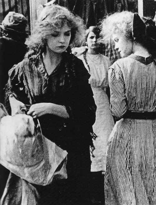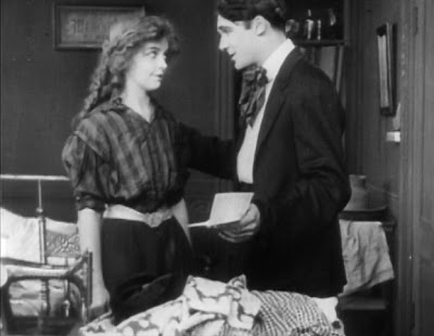 As she exits her one-room apartment one day, The Little Lady runs into Snapper Kid, king of the Musketeers of Pig Alley, the gang that threatens the streets and alleys that surround the tenements.  Upon seeing the lovely young woman, Snapper Kid makes a move on her, which she fights off in no uncertain terms by slapping the man.  Startled by her reaction, Snapper Kid watches as The Little Lady exits the tenement to go about her business among the crowded sidewalks of Pig Alley.