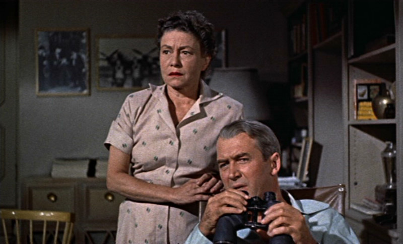 Rear Window features as great a list of players as have ever starred in a Hitchcock film.  James Stewart is wonderful as Jeffries even though much of his acting in the film is completely dictated by editing.  With the exception of the exchanges inside his Greenwich Village apartment, his entire performance is relegated to reaction shots as the suspense (and story) are seen almost entirely from his Point of View (POV).  All sounds easy but I doubt many other actors could have made the specific reaction shots work as well as they do but the likes of him.  Thelma Ritter as Stella is her usual rw2fantastic self in this.  With the familiar Brooklynese delivery she supplies the comic relief in the story.  And Grace Kelly, clearly one adored by Hitchcock’s camera, evident here from the moment Lisa is introduced – one of my favorite character introductions ever – as she appears out of nowhere, leaning ever closer to the camera (Jeffries’ POV) as she bends to kiss him hello.  In Rear Window Kelly gives one of my favorite performances, starting off as the usual ice princess and gaining heat as the excitement of the intrigue builds.  And her performance is greatly enhanced by the outfits designed for her by Edith Head.  As Lisa’s character grows increasingly adventurous, we can see her style change from high fashion evening wear to jeans.  I mean, she’s still Grace Kelly, but as casual as she ever gets in a Hitchcock film.