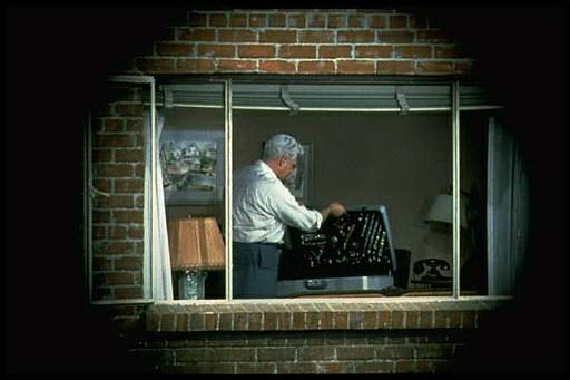 The camera pans across a courtyard bypassing windows, showing glimpses of life.  The view is – counter-clockwise and in full circle – from a rear window.  Our perspective changes as the camera dictates and as it completes the circle we enter sleethrough that rear window and land upon the sweaty forehead of a sleeping man.  The thermostat reads ninety-plus degrees, a warning that a brutal day lies ahead.  But the residents of the buildings that surround the courtyard start their daily routine just like any other day.  A man shaves and listens to the radio, another man and woman rise from their makeshift bed on the fire escape, a young woman makes her breakfast and a bird is uncovered alerting it that morning has arrived.