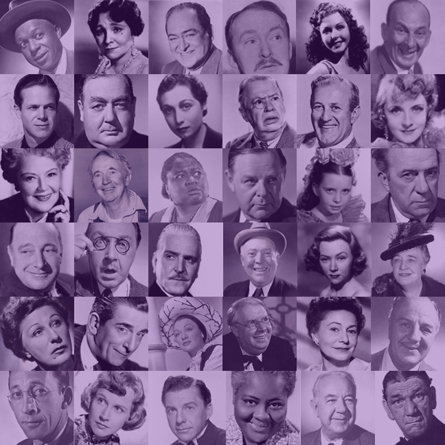 The faces on the banner: Row 1: (L-R) Eddie “Rochester” Anderson, Margaret Dumont, Edward Arnold, Albert Dekker, Ann Miller, Leon Errol Row 2: (L-R) Dan Duryea, Eugene Palette, Aline MacMahon, Charles Coburn, Lee J. Cobb, Billie Burke Row 3: (L-R) Spring Byington, Walter Brennan, Hattie McDaniel, Gene Lockhart, Margaret O’Brien, Edgar Kennedy Row 4: (L-R) Eric Blore, Franklin Pangborn, Frank Morgan, Guy Kibbee, Gloria Grahame, Jane Darwell Row 5: (L-R) Judith Anderson, Edward Everett Horton, Eve Arden, S.Z. “Cuddles” Sakall, Thelma Ritter, Louis Calhern Row 6: (L-R) Charles Lane, Kim Hunter, David Wayne, Louise Beavers, Cecil Kellaway, Shemp Howard