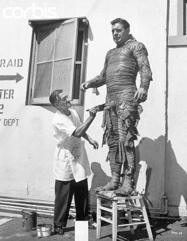 Make-up man Jack Pierce puts the finishing touches, a liquid solution of Fuller’s earth, on actor Lon Chaney, who is being made-up to play the part of the murderous monster- mummy Kharis. Chaney, incidentally is swathed in 400 yards of specially prepared gauze tape for the 1943 Universal production of “The Mummy’s Ghost”. Undated movie still. — Image by © Underwood & Underwood/CORBIS