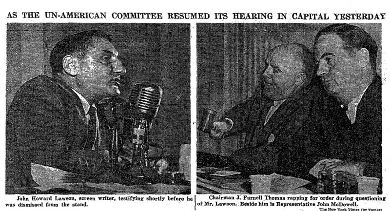At the end of the first week of the hearings, HUAC Chairman, J. Parnell Thomas announced the second week would follow with mention of the order in which the “unfriendly” list of witnesses would testify.  However, when October 27th came the order cited the previous Friday had disappeared and several of the “unfriendly” witnesses were called at the last moment, just prior to appearance on days when they were not expecting to testify.  Writer, John Howard Lawson was one of those, discovering that Monday morning that he was to be the first witness.  Lawson would become the first of the Hollywood Ten, not only refusing to answer the key question, but was also unable to hide his contempt for HUAC.  Here is a clip of his testimony.