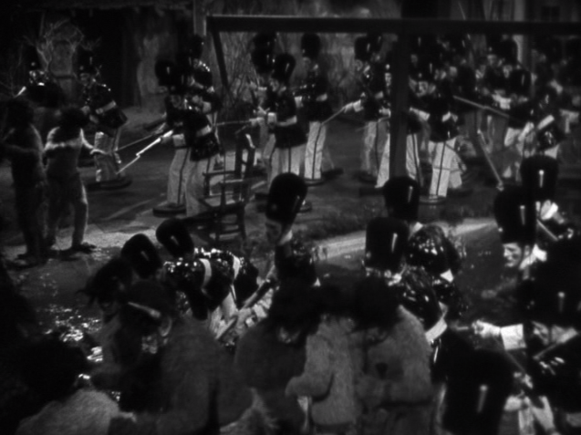 March of the Wooden Soldiers is loads of fun, a must-see during the holidays.  As one of the oldest of the perennial holiday favorites it has stood the test of time.  And not by happenstance.  For the 1930s it’s an impressive production, which required the services of many independent workers unlike most other films being made.  March took twelve weeks to make and had approximately 300 people appearing in it in one manner of another.  A Hollywood crocodile “farm” supplied the reptiles used in the swamps that surround Bogeyland, reptiles that were so ferocious that it was necessary to have armed guards stand by while expert swimmers, playing the role of “boogeymen”, were in the water with them.  Although IMDB notes the production was plagued with injuries, it’s a wonder not one person was seriously hurt during the making of the film.  In addition to the crocodiles, ensuring costuming for such a large cast was an impressive undertaking.  Over two hundred of the furry suits with rubber masks were made for the Bogeymen, and over one hundred period costumes were needed for the villagers who, as mentioned above, represented characters of many of the popular fairy tales.  Over three hundred wigs were supplied by outside specialists and were cared for during production by a staff of 12 hairdressers.  (Picturegoer Weekly)