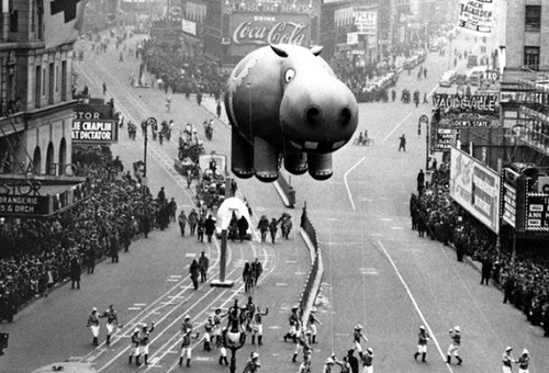 21 Nov 1940, Times Square, Manhattan, New York, New York, USA — Hippo Balloon Floating at the Thanksgiving Day Parade — Image by © Bettmann/CORBIS