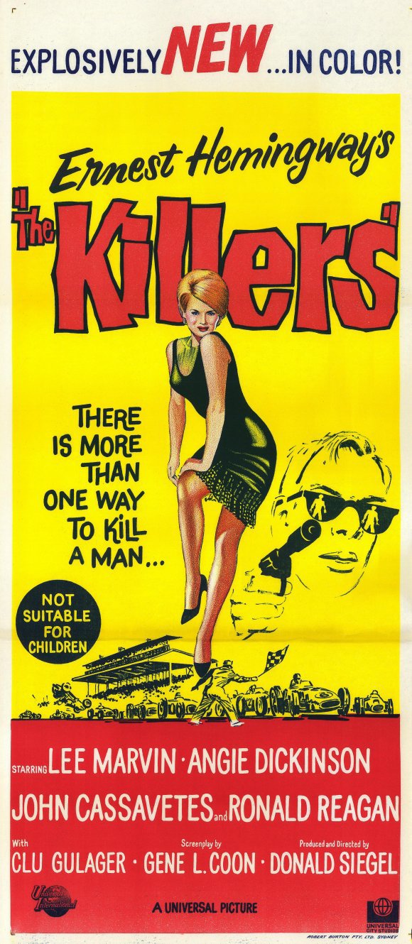 64Don Siegel’s remake features an all-star cast and fine performances across the board.  Leading the pack is Lee Marvin who gets extra points for playing a definitive hired killer.  His appearance alone is enough to send this viewer scurrying out of the way.  John Cassavetes plays race-car driver, Johnny North, a revamp of Lancaster’s ex-boxer, with Angie Dickinson taking on the role previously played by Gardner, only now her name is Sheila Farr.  Astounding beauty is replaced by sheer sexiness.   And Ronald Reagan in his last significant screen role is very convincing as bad guy, Jack Browning, the counterpart to Albert Dekker’s Big Jim Colfax in 1946.