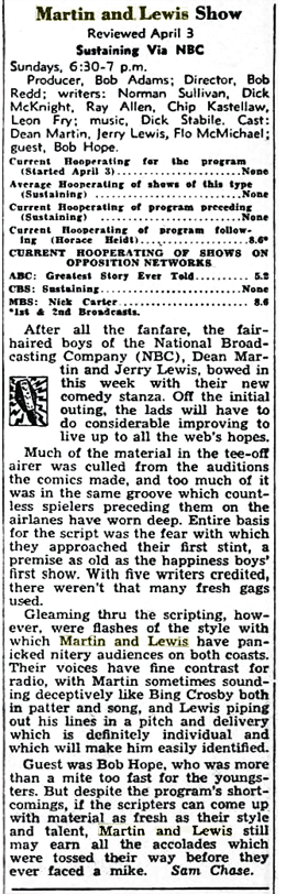 Billboard’s review of the Martin and Lewis radio show premiere on April 3, 1949. (April 30, 1949)