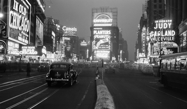 12 Feb 1938, Times Square, Manhattan, New York, New York, USA — Loews State Theatre with marquee advertising Judy Garland in person. Times Square at night. — Image by © Bettmann/CORBIS