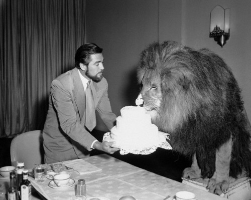 10 May 1952, USA — Motion picture actor Steve Cochran tries to interest Jackie, the lion, in a three layer cake, at a recent luncheon, but the king of beasts only sniffed and declined on May 10, 1952. He may have had a close supply of fresh meat, which was nearby in mind, but he behaved himself like a gentleman. The luncheon was given for members of the press. (AP Photo/Ellis Bosworth) — Image by © Ellis Bosworth/AP/Corbis