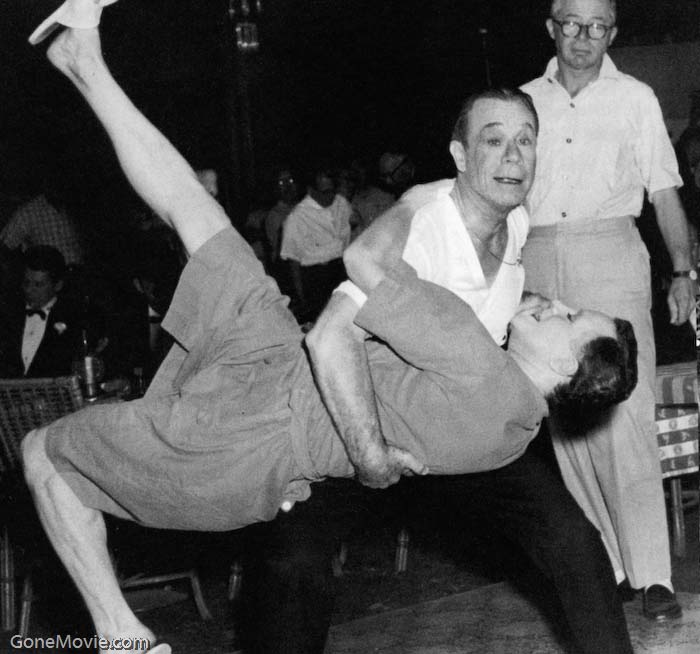 Joe E. Brown (Osgood Fielding III) teaches Jack Lemmon (Daphne) how to tango. Wilder observes.