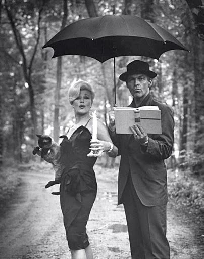 Ginger Rogers with her fifth husband, actor William Marshall spoofing Bell Book & Candle. Complete with Pyewacket cat. In the rain.