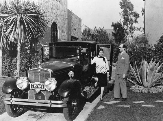 Dolores Del Rio about to leave home for the studio in her Franklin. Husband Jaime holds the door for her