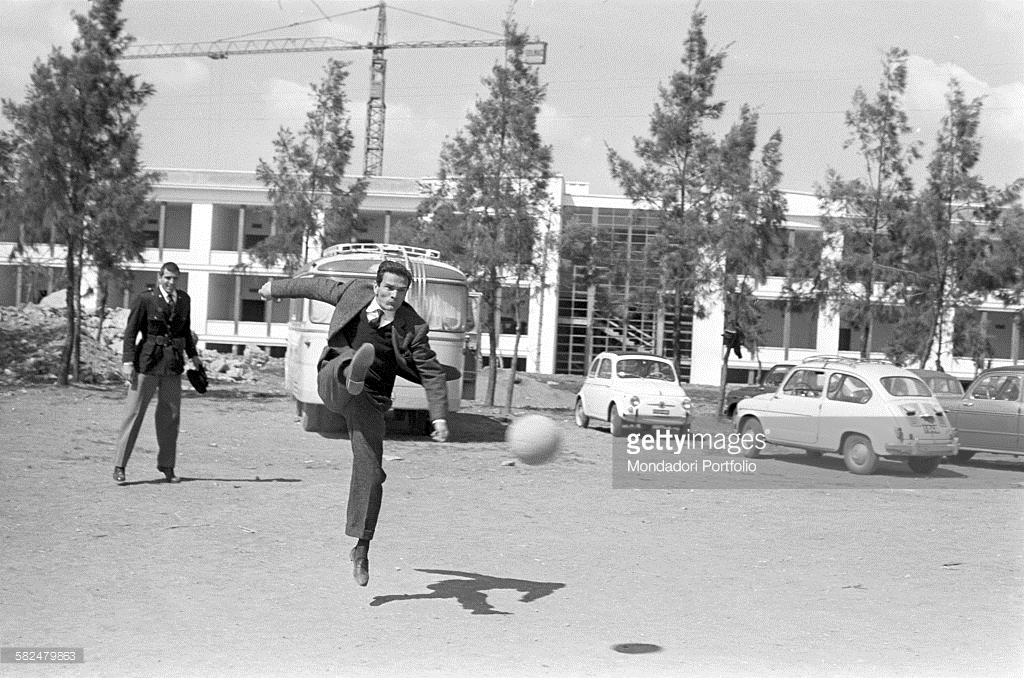 Pier Paolo Pasolini (1922 – 1975) kicking a football during a break in the filming of his drama, ‘Accattone’