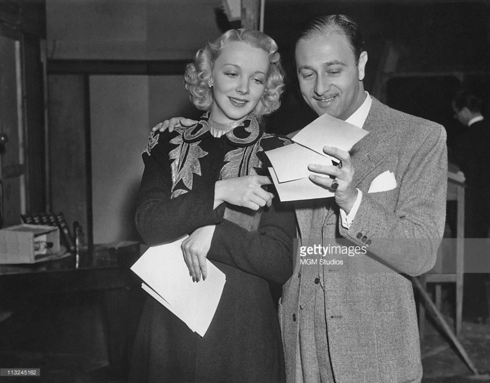 Virginia Bruce reading her fan mail with film director Edwin Marin