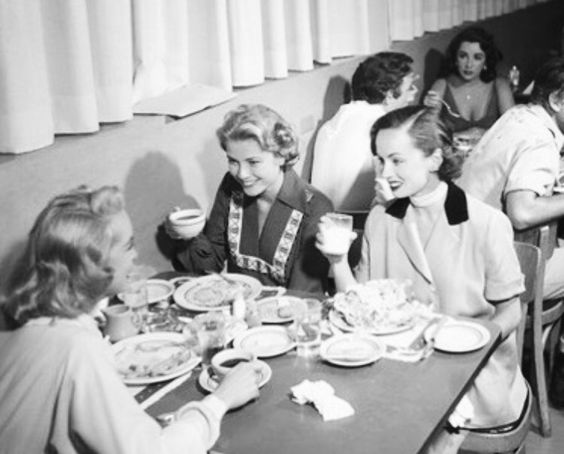 Grace Kelly eating with Ann Blyth and Janet Leigh in the MGM commissary. Elizabeth is in the background
