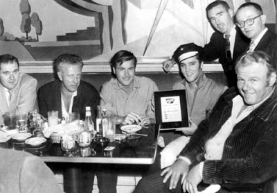 Robert Wagner, Elvis Presley and Alan Hale Jr. lounge around the 20th Century Fox commissary circa October, 1956