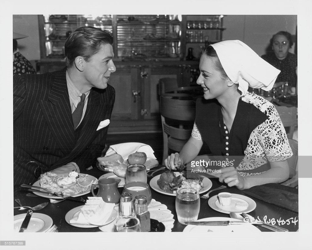Ronald Reagan and Olivia de Havilland eating lunch together at the Warner Bros Studio commissary