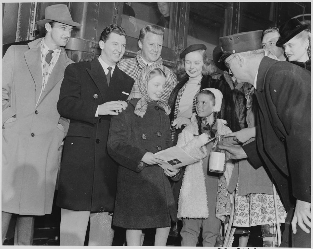 Photograph of Margaret O’Brien signing an autograph while Zachary Scott, Eddie Bracken, Van Johnson, Diana Lynn, and others look on.