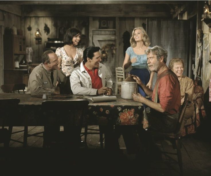 Standing: Yvonne Craig and Pamela Austin. Sitting: Jack Albertson, Elvis Presley, Arthur O’Connell and Glenda Farrell in the Tatum shack located in the Smokey Mountains of Tennessee