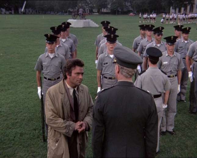 Now to my favorite part of “By the Dawn’s early Light” – Columbo himself (what a surprise). Our Lt. is a complete mess and I’ve never loved him more. Columbo’s hair is uncombed for most of the episode, with several scenes featuring Columbo bed hair. His raincoat is also particularly wrinkled here. I assume the idea for the efforts put into Columbo’s extra disheveled look in the episode is intended to pose an even greater contrast between him and the site of his investigation in this case, a military academy and all its pristine players. As powerful as it may be, however, military order is no match for the seemingly disorganized Columbo, who even goes a couple of days without showering during this investigation. It’s those kinds of details that remind us of the extraordinary symbiotic relationship between Peter Falk and Columbo, how inherent the role was in him and he in it. And of course, this type of thing is also what makes Columbo one the greatest characters in TV history.