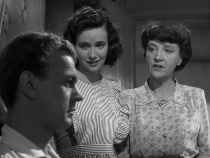 Young Charlie runs into two girlfriends twice – here she is accompanied by Det. Jack Graham (Macdonald Carey)
