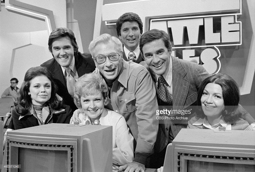 Jo Ann Pflug and Chuck Woolery, Betty White and Allen Ludden, host Burt Convy, Pat Harrington and Marjorie Harrington. Image dated February 10, 1974.