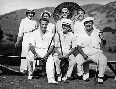 At the course – Front row, left to right, P.K. Wrigley, Stan Laurel, Oliver Hardy; back row, Mrs. Hardy, Mrs. Wrigley, Mrs. Laurel and Jan Gaber.