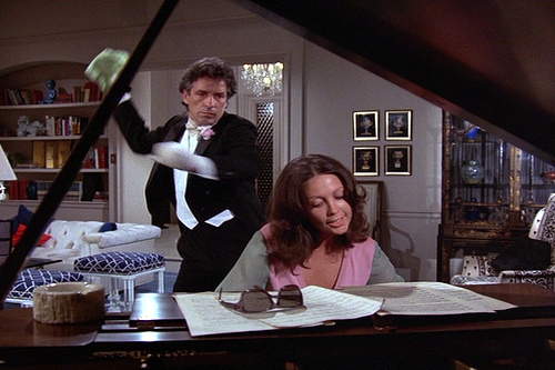 One last thing – or maybe two. I can’t stop. I try my best to make these posts unique but in truth a large part of what make Columbo episodes such treats for fans are the formulas they adhere to. An element of that formula is the guest star or stars, many from classic Hollywood film fare, that appear in the episodes. Étude in Black goes beyond that. The “regular” cast is great – no need to mention how memorable Peter Falk is because that’s just a given. Here you get an enjoyable cameo by Pat Morita to add to the terrific turns by the main players. In addition to Cassavetes in Étude, Blythe Danner delivers an affecting performance as Benedict’s stoic wife who, left with no other choice, faces the music (pun intended) in the end. The scene where Janice comes to the realization that her husband is a murderer is painful to watch.