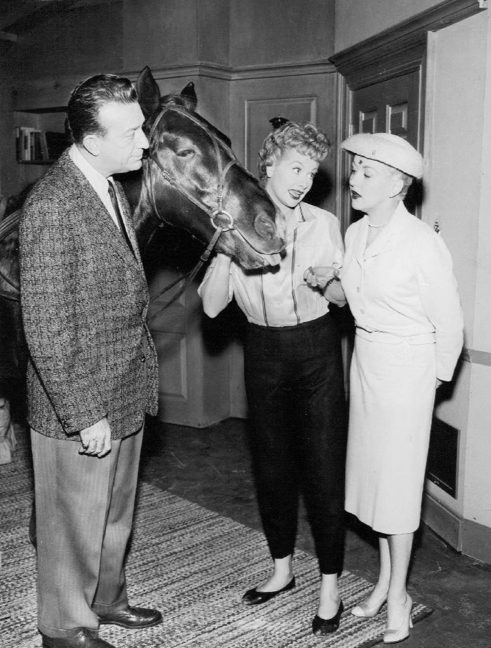 Publicity photo for “Lucy Wins a Racehorse” featuring Lucy with Tony (horse) and guest stars Harry James and Betty Grable.