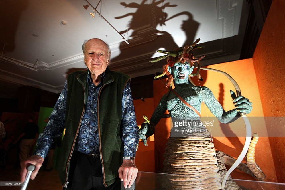 LONDON, ENGLAND – JUNE 29: Special effects creator Ray Harryhausen poses for photographs with an enlarged model of Medusa from his 1981 film ‘Clash Of The Titans’ at the The Myths And Legends Exhibition at The London Film Museum on June 29, 2010 in London, England. Ray Harryhausen is considered the father of modern day special effects. In total Ray made sixteen landmark fantasy films including ‘Jason And The Argonauts’ (1963), ‘One Million Years BC’ (1966) and his last feature ‘Clash Of The Titans’ (1981). The exhibition includes original models and artwork and opens on June 29, 2010. (Photo by Peter Macdiarmid/Getty Images)