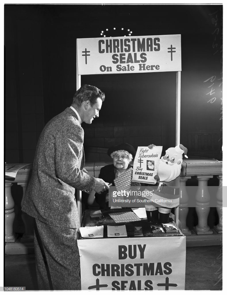 Christmas seal booth opened…subway terminal building, 7 December 1951.;Richard Webb, Actor;Mrs Helen Miller, in charge of booth.;Supplementary material reads: ‘Los Angeles County Tuberculosis & Health Assn. Bob Scholl. DUnkirk 8-3401. 1951- 12-07. Photo Identification: #209: Warner Bros. ‘Distant Drums’ star Richard Webb and Mrs Helen Miller, in charge of booth. At the Christmas Seal booth opened today at the Subway Terminal Building in downtown Los Angeles. Other downtown booths are located at the Spring Arcade Building and at the. E Building at 6th and Main. A fourth booth opens Monday at the Biltmore Hotel’.. (Photo by Los Angeles Examiner/USC Libraries/Corbis via Getty Images)