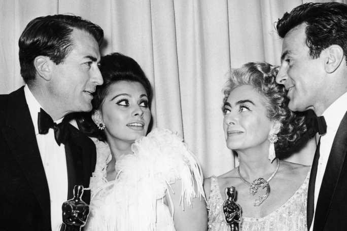 1963 Oscars – Gregory Peck, Sophia Loren, Joan Crawford, and Maximilian Schell stand backstage at the Santa Monica Civic Auditorium, Los Angeles. Joanie looks very comfortable holding someone else’s Oscar, doesn’t she?