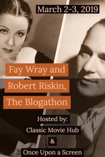 This is one of my entries for Fay Wray and Robert Riskin, The Blogathon, which was created to celebrate the release of Fay Wray and Robert Riskin: A Hollywood Memoir on February 26, 2019. The book is written by their daughter, Victoria Riskin. I’ve read it and can tell you it is a fantastic read. I am also thrilled to be co-hosting this blogathon with friend Annmarie at Classic Movie Hub. Be sure to visit both our blogs on March 2 and 3 for fabulous entries honoring two extraordinary careers.