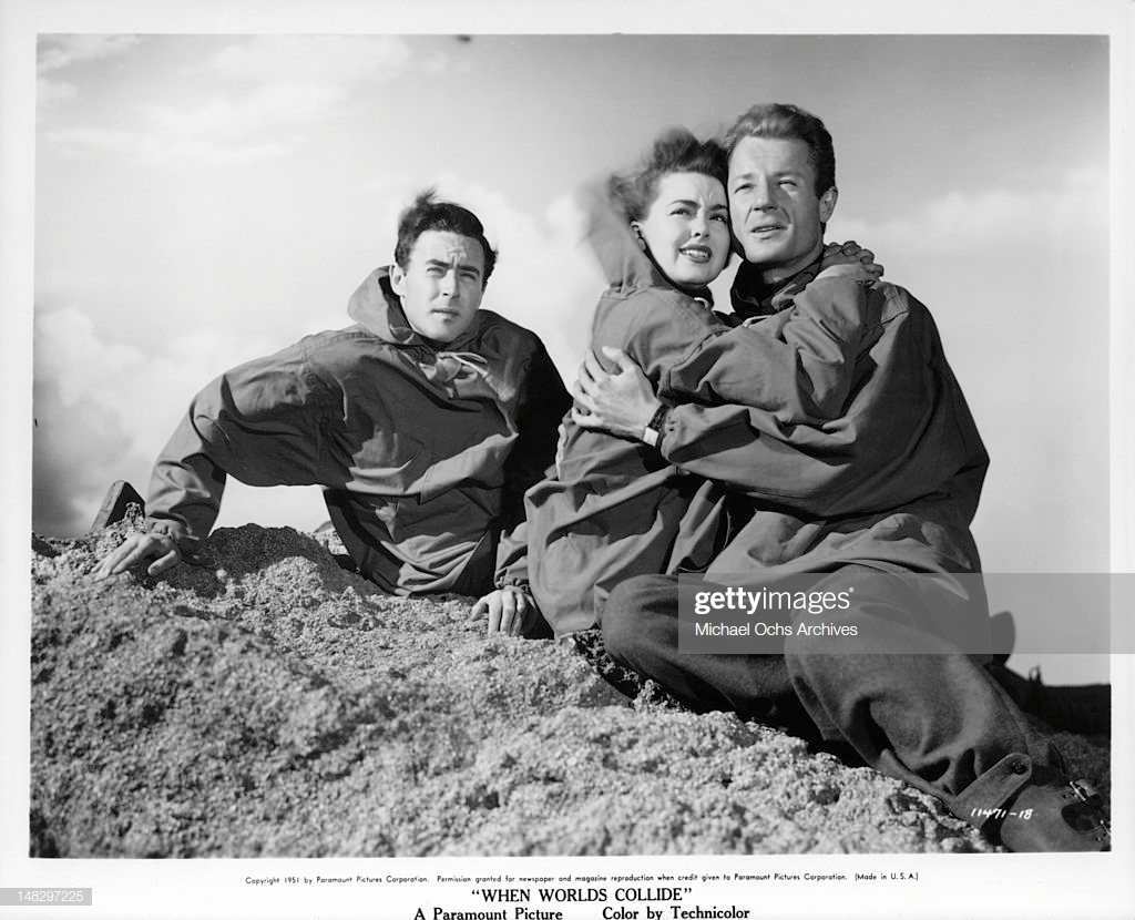 Peter Hansen, Barbara Rush, and Richard Derr looking up to the sky in a scene from the film ‘When Worlds Collide’, 1951. (Photo by Paramount/Getty Images)